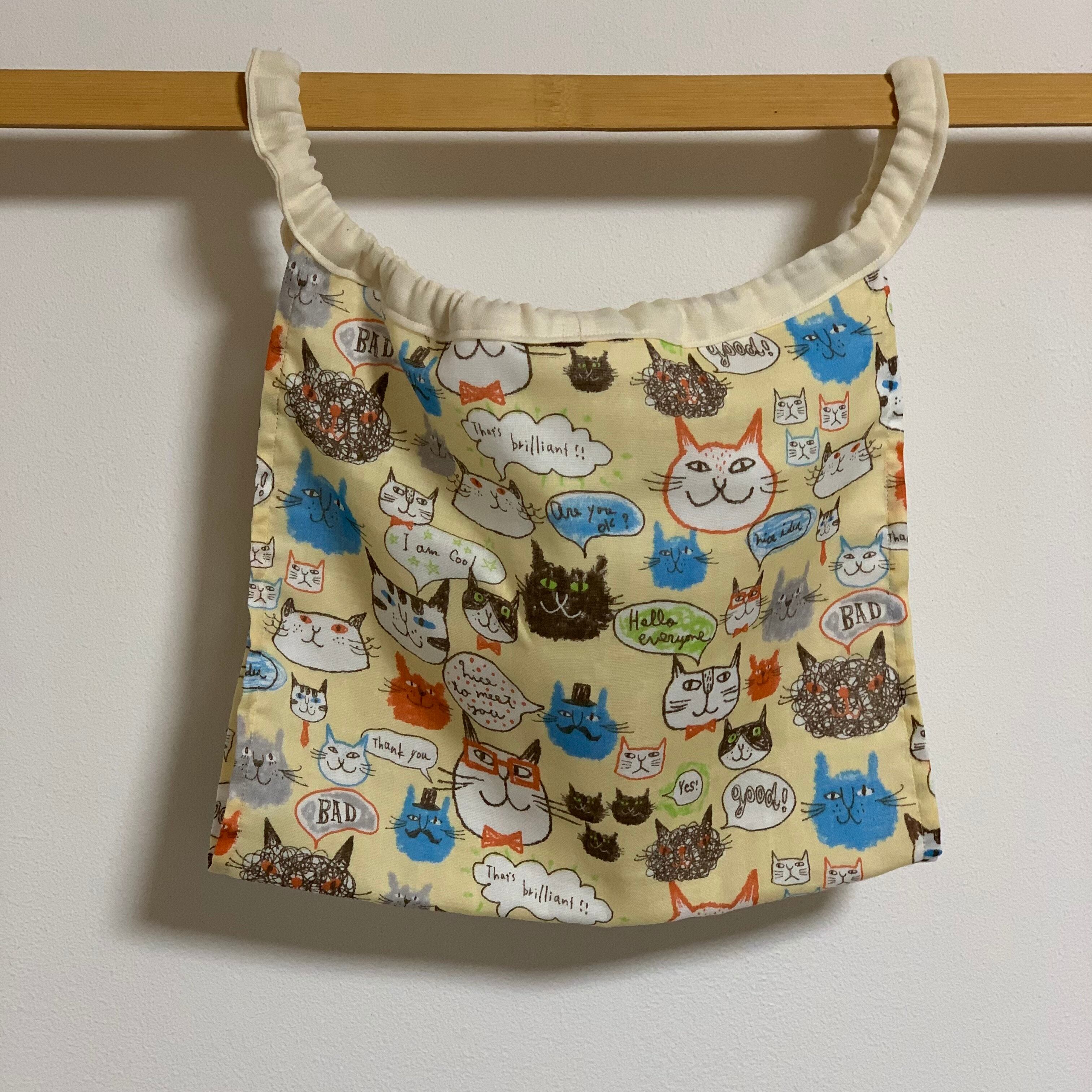 アイボリーのニャンコ生地にアイ。ホワイトの紐の組み合わせです。