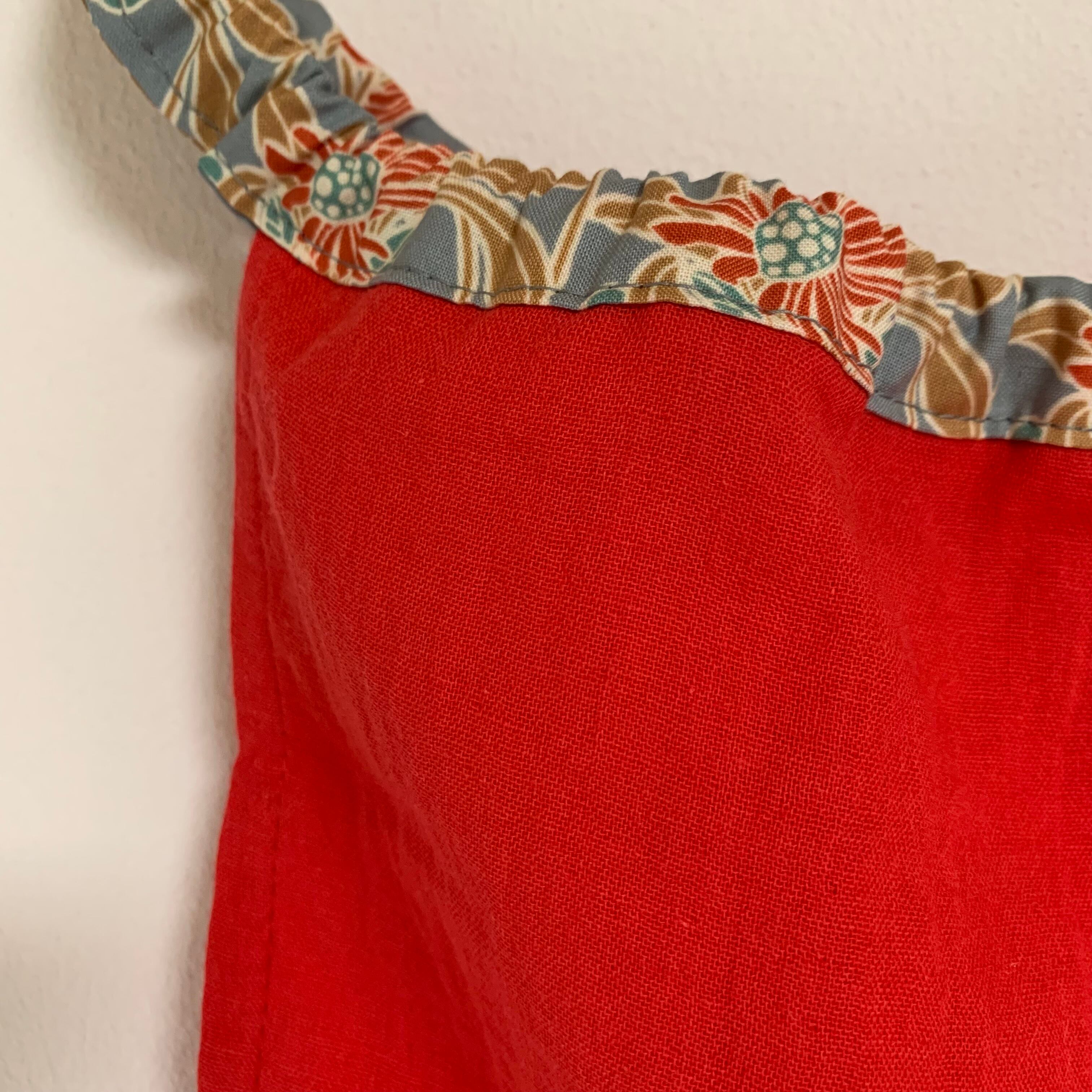 フェミニンな花模様の紐と元気な赤の組み合わせ。