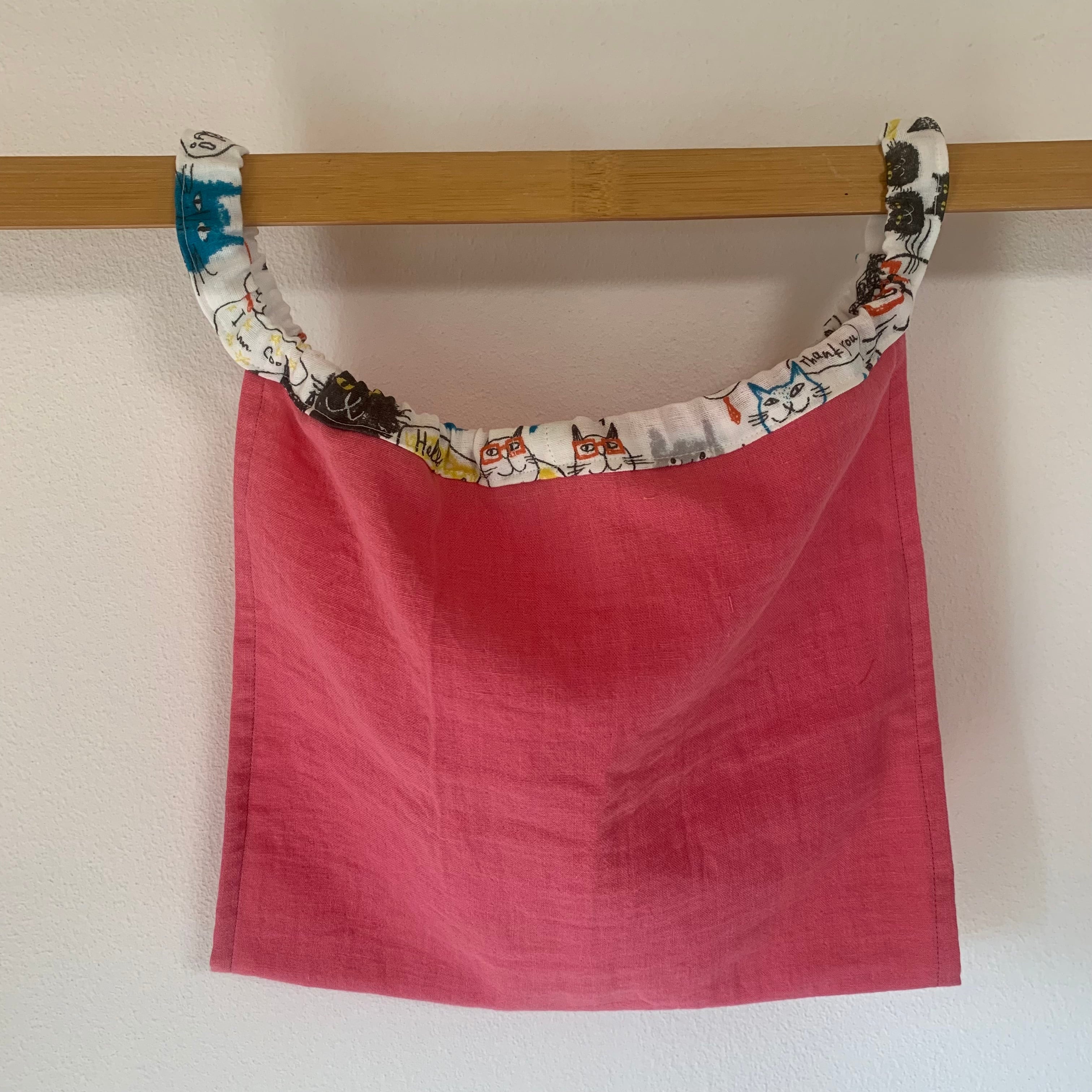 ピンクのみごろとMiyako Kawaguchiさんの猫ちゃんのプリントのヒモの組み合わせがにゃんともかわいいふんぱんです。