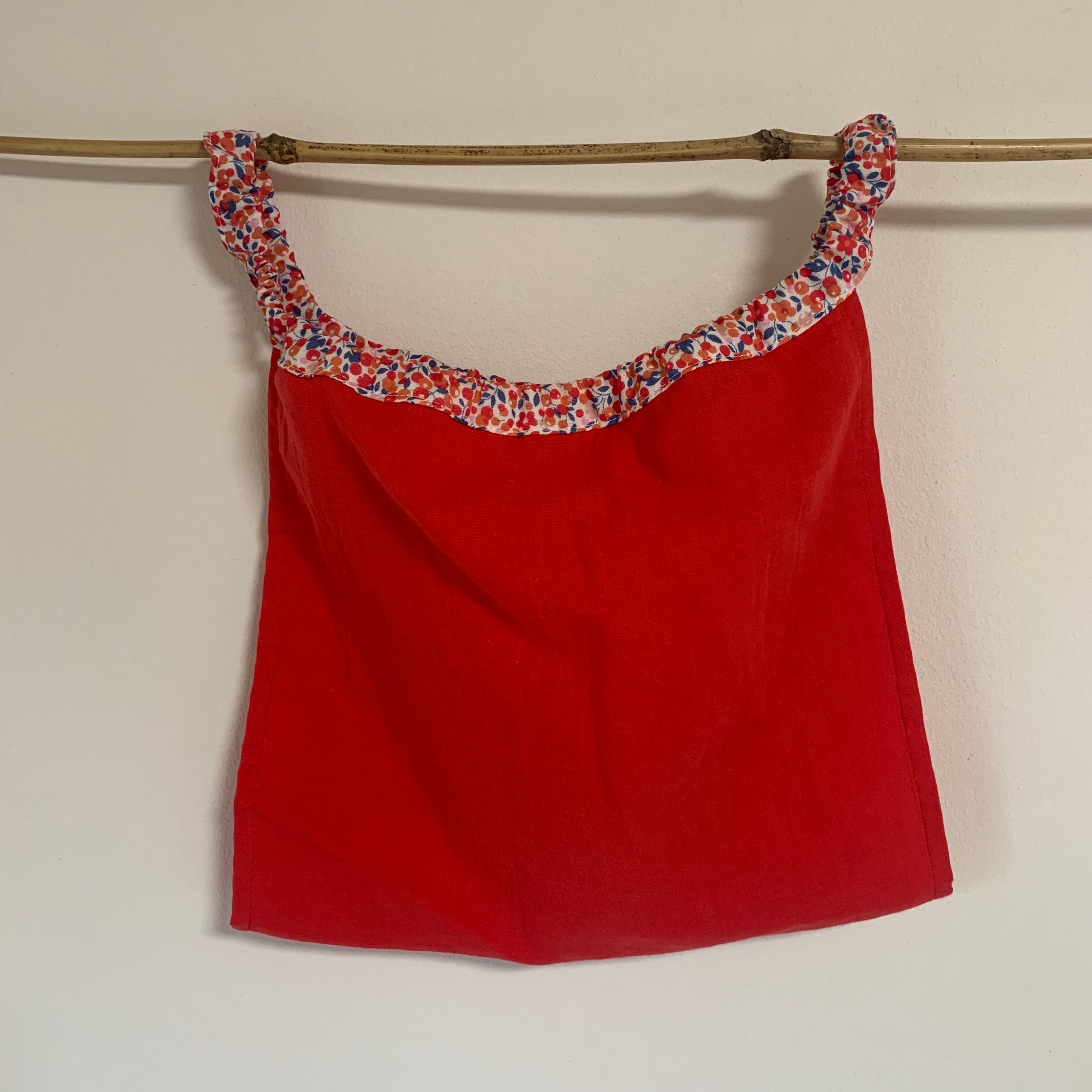 元気な赤の生地にかわいい小花柄ふんぱんです。
