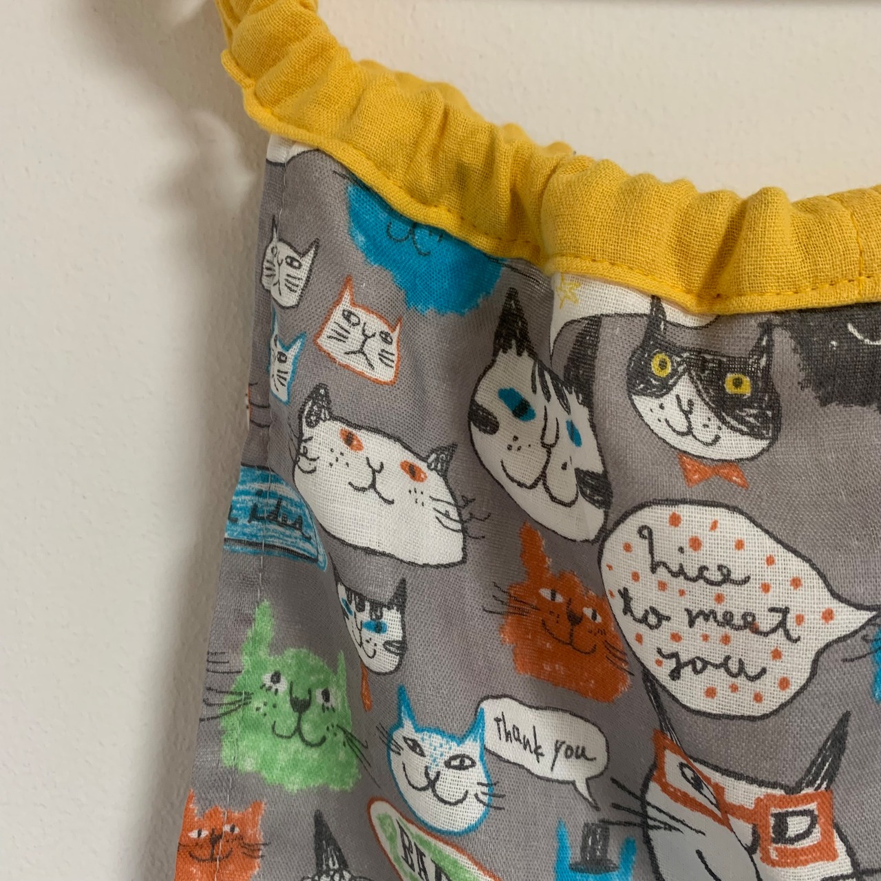 グレーニャンコ生地にイエローの紐の組み合わせです。