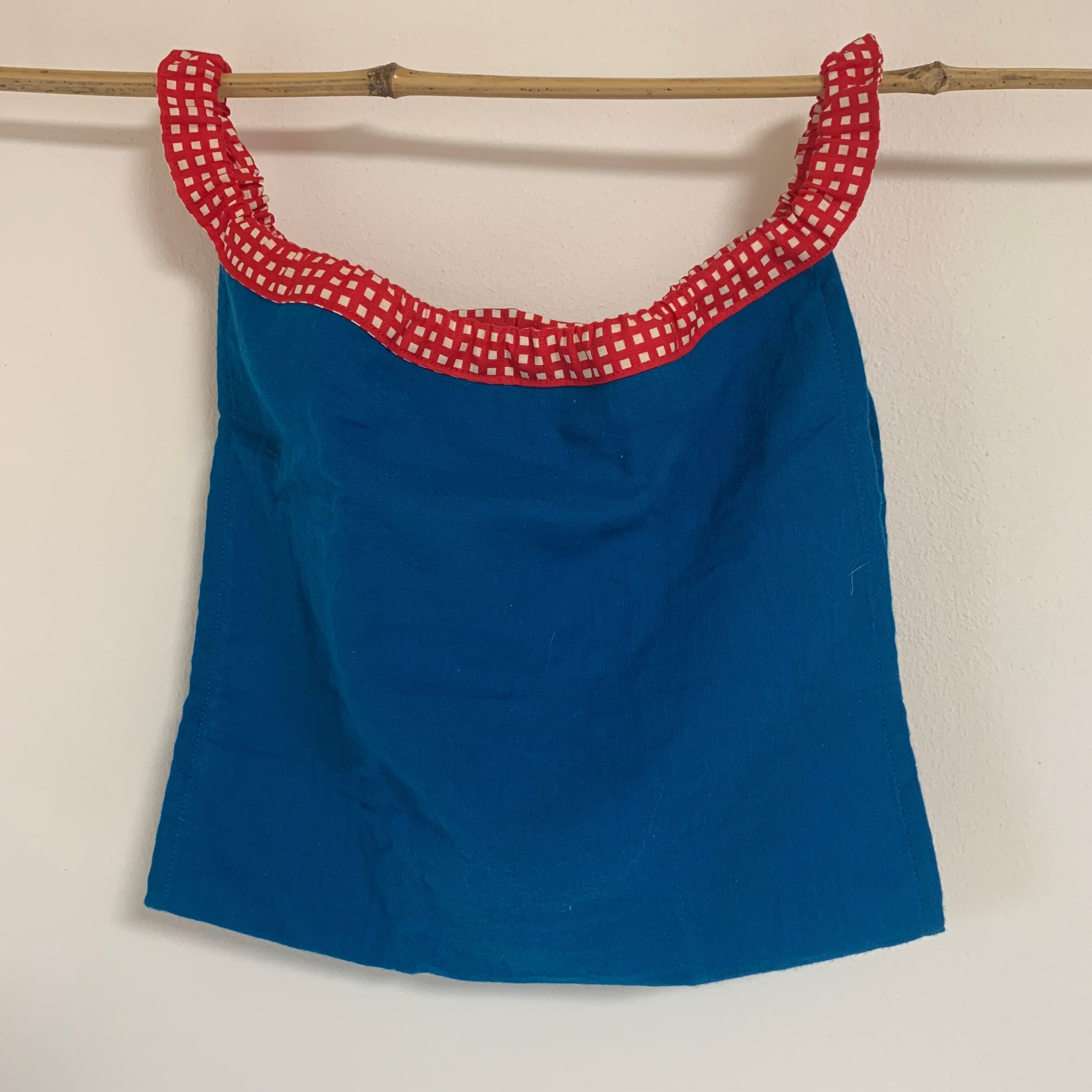 ブルーの生地✖️赤いブロックチェックの紐のふんぱんです。
